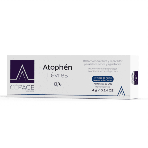 Atophén Lèvres es un bálsamo hidratante y reparador para labios secos y agrietados. Atophén Lèvres está especialmente formulado con una asociación de Manteca de Karite, Manteca de Cacao y aceites vegetales que protegen y reparan labios dañados y secos.