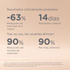 Reduce rápidamente las manchas faciales: Melaclear Advanced ha sido testado, demostrando una reducción del 63% de manchas¹ oscuras, promoviendo una piel homogénea y radiante.