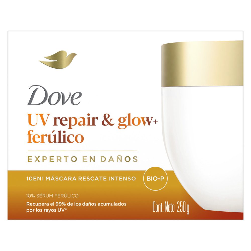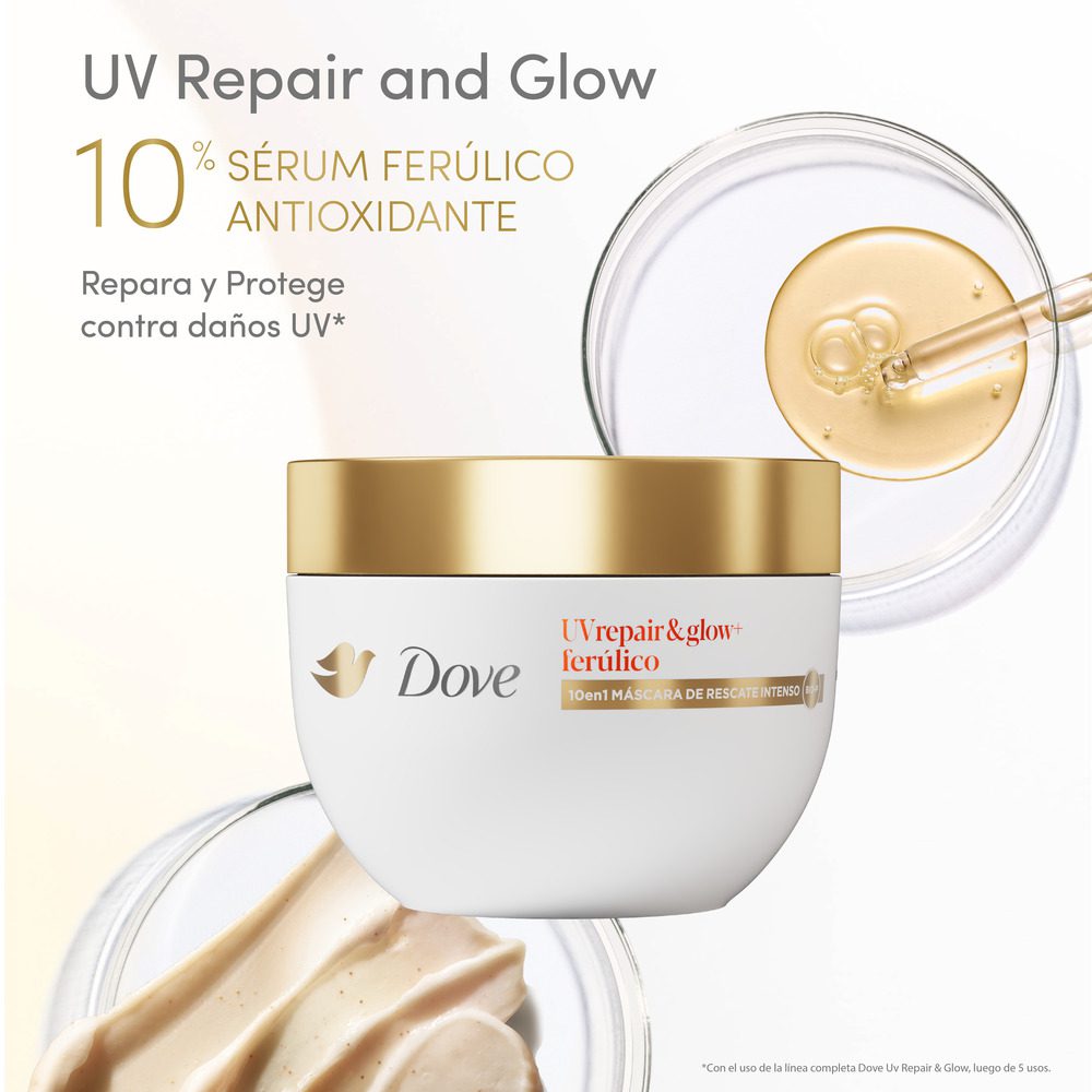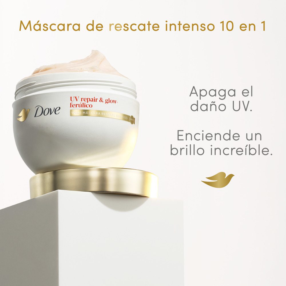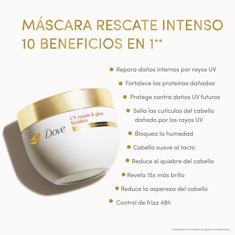¿Sabías que los rayos UV dañan 4 veces más el cabello que las herramientas de calor? Si tu pelo luce opaco y sin brillo debido a la exposición solar, llegó la solución que estabas esperando: la nueva Máscara de Rescate Intenso 10 en 1 Dove UV Repair & Glow.
