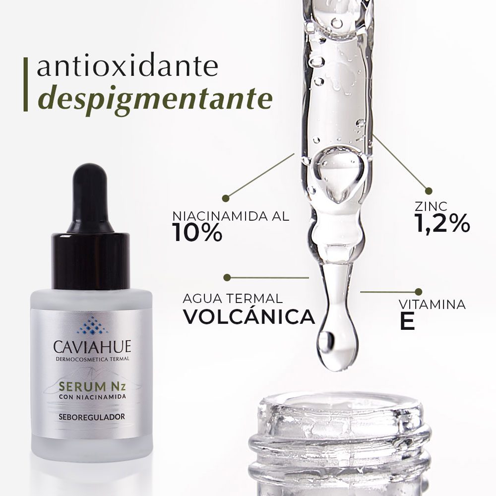 El Sérum facial NZ de Cremas Caviahue es un potente tratamiento diseñado para balancear y reparar la piel. Formulado con Niacinamida al 10%, agua termal volcánica y vitamina E, este sérum facial penetra profundamente en la piel, disminuyendo poros dilatados y la oleosidad de la piel. Su fórmula ligera y de rápida absorción lo convierte en un complemento ideal para cualquier rutina de cuidado facial. Con el uso regular, el Sérum facial NZ tiene Acción antiinflamatoria: descongestiona e hidrata pieles sensibles.